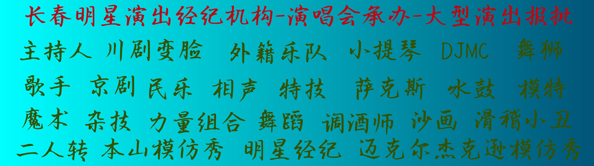 吉林長春慶典演出公司-承接各類慶典演出策劃、開業慶典、周年慶典、頒獎慶典、商業演出、演藝團隊、開工慶典、奠基慶典、落成慶典、投產儀式、喬遷慶典、會務論壇活動、行業會議、高峰論壇、經銷商會議、代理商會議、新品發(fā)布會、年會晚會活動、公司企業年會、年終晚會、文藝晚會、中秋晚會、周年晚會、音樂節(jié)、消夏啤酒節(jié)、明星演唱...